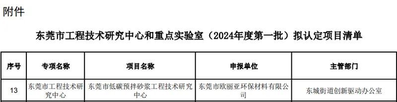東莞市歐麗亞環保材料有限公司榮獲市級工程技術研究中心認定,引領低碳建材新篇章
